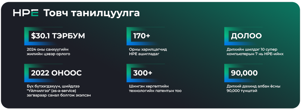 Hewlett Packard Enterprise (HPE) нь дэлхийн дата төв, сервер, дата сангийн технологийн салбарт тэргүүлэгч, инновацийн манлайлагч компани юм. HPE нь уламжлалт дэд бүтцийн нарийн төвөгтэй байдлыг халж, үр ашиг, хялбар байдлыг нэгтгэсэн Hyper-Converged Infrastructure (HCI) шийдлээрээ зах зээлд тэргүүлдэг. Технологийн судалгааны Gartner зэрэг байгууллагын үнэлгээгээр HPE-ийн HCI шийдлүүд нь найдвартай ажиллагаа, хиймэл оюунд суурилсан ухаалаг удирдлагаараа бусдаас ялгарч, дэлхий дахин дахь олон мянган байгууллагын сонголт болоод байна.