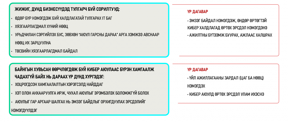 - DNS cache poisoning: DNS-ийн cache өгөгдлийг хуурамч (rogue) хаягаар гэмтээх (хордуулах) оролдлогыг таньж, хүчингүй болгоно.