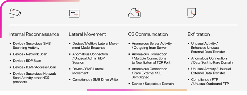 Darktrace/NETWORK нь бүх 14 MITRE ATT&CK ангиллын хамрах хүрээг хангадаг. Энэ нь хуучин өгөгдөл, статик дүрэм, гарын үсэгт суурилсан аргуудыг ашиглахгүйгээр халдлагын үе шат бүрд аюулыг илрүүлдэг. Darktrace/NETWORK нь таны сүлжээн дэх ер бусын зан байдал, аюул заналыг хэрхэн илрүүлдэг тухай цөөн хэдэн жишээг доор харуулав.