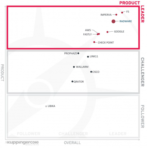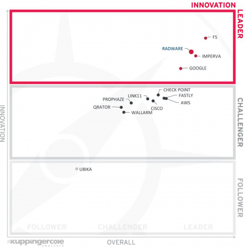 Тус үнэлгээ нь үндсэн 3 ангилал болох бүтээгдэхүүн, инноваци болон зах зээлийн манлайллын үнэлгээнүүдийг нэгтгэн харуулсан. Radware нь F5, Imperva зэрэгтэй зэрэгцэн энэ ангилалд тэргүүлсэн байна.
